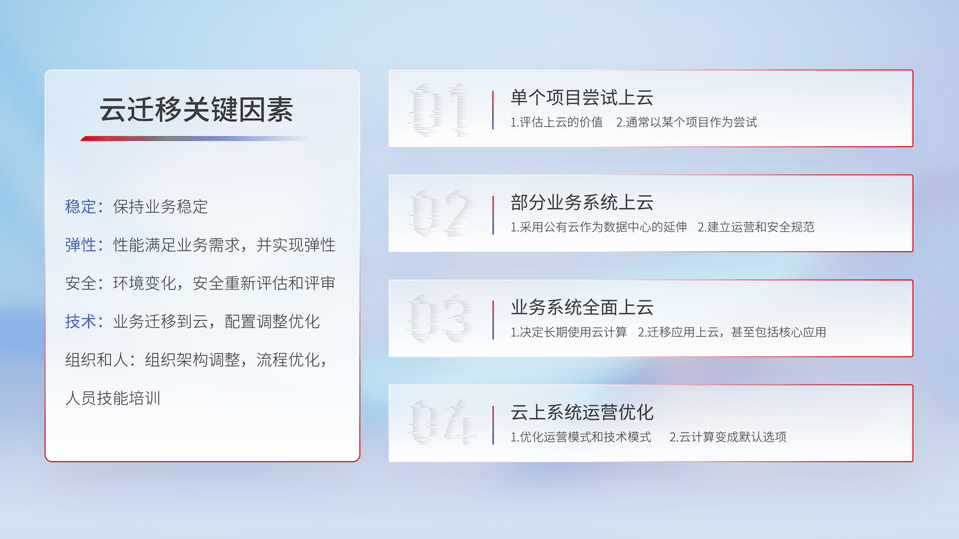 结合实际业务,,,从规划设计、、云平台选型、、云原生改造、、、数据迁移、、、、集成交付,,,迁移全过程为客户识别最佳上云路径,,,,做好风险识别管理,,设计网络架构、、身份权限、、、、安全审计合规、、、操作审计、、、日志审计、、监控告警策略、、、、多站点容灾设计等,,,,对云上基础设施进行整体规划,,,提升IT治理水平,,以满足弹性、、、、高可用、、、高性能的需求。。。