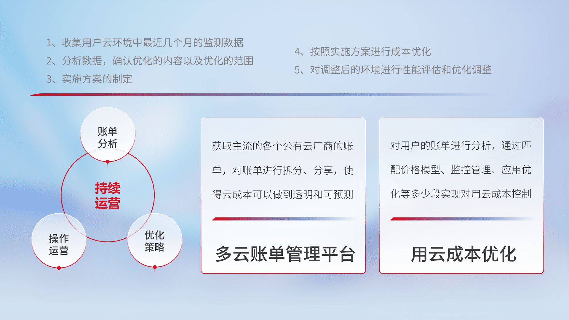 通过多云纳管,,,,以统一的资源数据模型把客户的云资源进行抽象和封装,,,进而实现对多云资源的统一操作,,保障云资源管理的可靠性、、、稳定性与可用性。。。。量身定制化运维内容,,配置、、开发运维、、、、补丁管理、、、、备份、、、、监控、、认证和访问管理、、、审计和日常巡检等,,,保障在用云过程中的可靠度,,稳定度以及高可用率。。。